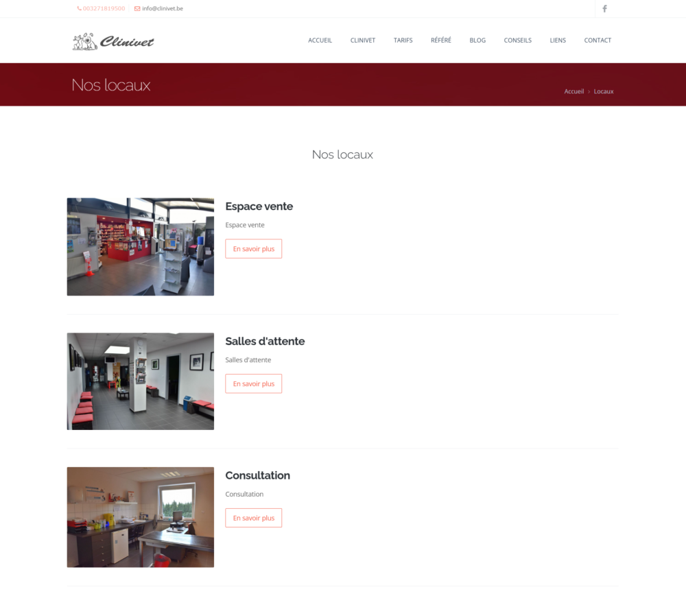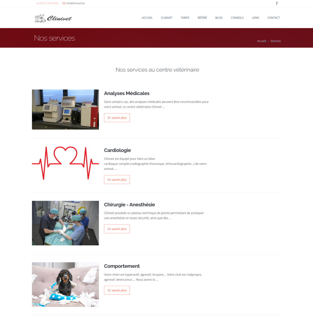 Création du site du Centre Vétérinaire Clinivet à Gosselies, avec une gestion claire des services, de l’équipe, du personnel et des locaux, dans une logique de visibilité locale autour de Charleroi et du Hainaut.